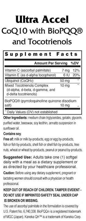 List of ingredients include: Vitamin C (ascorbyl palmitate), Vitamine E (as d-alpha tocopherol), Ubiquinol (CoQH2), Mixed Tocotrienols Complex (d-alpha, d-beta, d-gamma and d-delta tocotrienols), BioPQQ. Ultra Accel with PQQ is the ONLY nutrient proven to make more of the tiny "power generators" in your cells