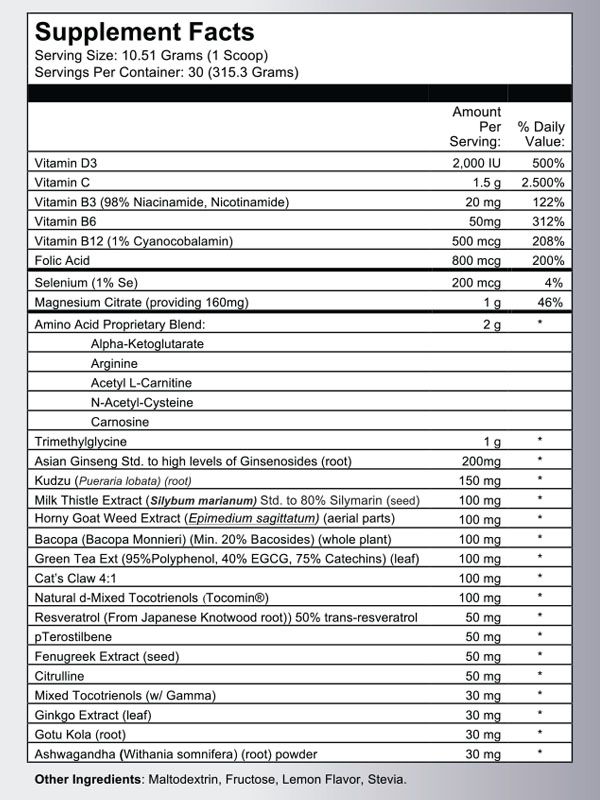 Vitamin D3, Vitamin C, Vitamin B3 (98% Niacinamide, Nicotinamide), Vitamin B6, Vitamin B12(1% Cyanocobalamin), Folic Acid, Selenium(1% Se), Magnesium Citrate(providing 160mg), Trimethylglycine, Asian Ginseng Std. to high leveld of Ginsenosides(root), Kudzu(Pueraria lobata)(root), Milk Thistle Extract(Silybum marianum) Std. to 80% Silmarin(seed), Horny Goat Weed Extract(Epimedium sagittatum)(aerial parts), Bacopa(Bacopa Monniere)(Min. 20% Bacosides)(whole plant), Green Tea Ext(95% Polyphenol, 40% EGCG, 75% Catechins)(leaf), Cat's Claw 4:1, Naturla d-Mixed Tocotrienols(Tocomin®), Resveratrol(From Japanese Knotwood root)) 50% trans-resveratrol, pTerostilbene, Fenugreek Extract(seed), Citrulline, Mixed Tocotrienols(w/ Gamma), Ginkgo Extract(leaf), Gotu Kola(root), Ashwagandha (Withania somnifera)(root) powder.